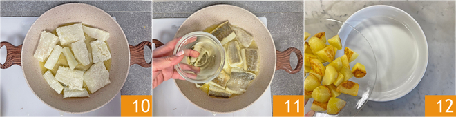 In derselben Pfanne, in der Sie die Kartoffeln angebraten haben, braten Sie den Kabeljau bei hoher Hitze für 2 Minuten an 10 und löschen Sie dann mit Weißwein ab 11, lassen Sie ihn verdampfen und schalten Sie die Hitze aus. Geben Sie die Kartoffeln in eine geölte Auflaufform 12.