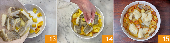 Fügen Sie auch den Kabeljau mit der Hautseite nach oben hinzu 13, salzen 14 und pfeffern Sie. Backen Sie im vorgeheizten Umluftofen bei 180° für 20 Minuten, dann nehmen Sie die Form aus dem Ofen, drehen die Kabeljaustücke um und backen sie für weitere 10 Minuten von der anderen Seite. Nehmen Sie den gebackenen Kabeljau mit Kartoffeln aus dem Ofen und servieren Sie ihn mit frischer Petersilie 15.