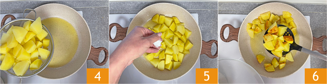 Gießen Sie die Kartoffeln ab. Erhitzen Sie in einer Pfanne 2 Esslöffel Öl und geben Sie die Kartoffeln hinzu 4, braten Sie sie 5 Minuten bei hoher Hitze an, salzen Sie 5 und rühren Sie um. Nehmen Sie sie heraus und stellen Sie sie beiseite 6.
