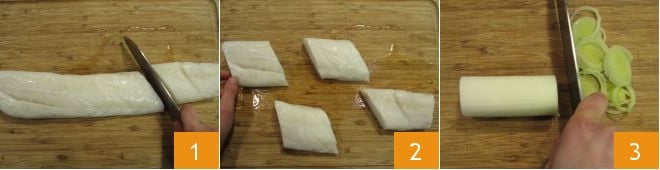 Um den im Ofen gebackenen Stockfisch zuzubereiten, schneiden Sie zuerst das Stockfischfilet (bereits entsalzt) in vier Stücke (1-2). Waschen und schneiden Sie den Lauch in Scheiben 3.