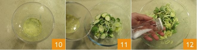 bis Sie eine glatte und homogene Sauce erhalten 10. In einer Schüssel mischen Sie den Lauch mit dem Rosenkohl und würzen Sie mit einem Teil der Emulsion 11; salzen Sie, aber moderat 12, da der Stockfisch, auch wenn er entsalzt ist, immer noch ziemlich salzig sein wird.