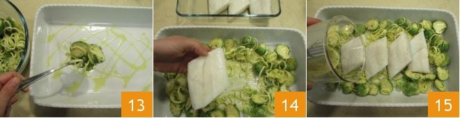 In einer leicht geölten Auflaufform geben Sie die bereits gewürzte Beilage 13 und legen Sie in die Mitte die Stockfischfilets 14, die Sie mit der restlichen Emulsion beträufeln 15.