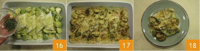 Pfeffern Sie und verteilen Sie den restlichen Teil der Kräuter 16. Backen Sie im vorgeheizten statischen Ofen bei 200° für ca. 35-40 Minuten (überprüfen Sie von Zeit zu Zeit das Garen, da es je nach Größe der Filets variieren kann). Nach dem Garen nehmen Sie die Auflaufform aus dem Ofen 17 und servieren Sie den im Ofen gebackenen Stockfisch heiß, begleitet von der Gemüsebeilage 18!