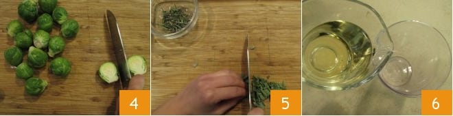 Waschen Sie den Rosenkohl, entfernen Sie die äußeren Blätter, wenn sie etwas beschädigt sind, und schneiden Sie ihn dann in Hälften 4. Hacken Sie Salbei und Rosmarin fein 5. Beiseite legen Sie diese Zutaten und kümmern Sie sich um die Gewürzsauce: Gießen Sie den Weißwein in ein hohes Glas 6,