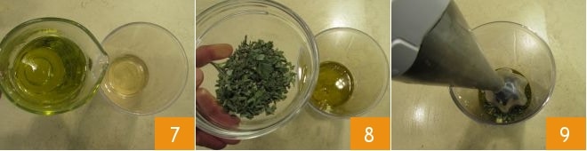den Senf, das Olivenöl 7 und die Hälfte des im Rezept vorgesehenen Kräuterhackens 8. Mixen Sie alles mit einem Stabmixer 9