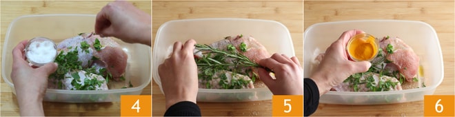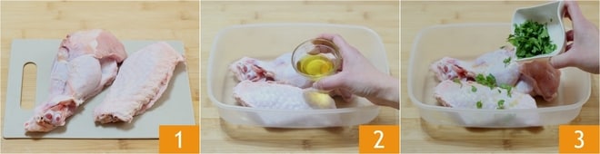 Zum Zubereiten des gebackenen Truthahns mit Kartoffeln den Truthahnkeule in zwei oder drei Teile schneiden 1. Das Fleisch gut waschen und mit einem Tuch abtrocknen. Das Fleisch in ein nicht zu großes Gefäß legen und mit Öl 2, gehackter Petersilie 3 würzen.