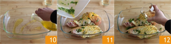 Eine Auflaufform mit Öl einfetten 10, nach der Marinierzeit den Truthahn in die Form mit der Marinade legen 11. Mit dem Wein würzen 12.
