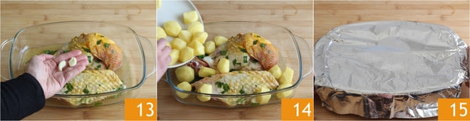 die geschälte Knoblauchzehe 13 und das Öl. Auch die Kartoffeln hinzufügen 14, mit einem Bogen Alufolie abdecken und 30 Minuten bei 200° im Umluftofen backen.