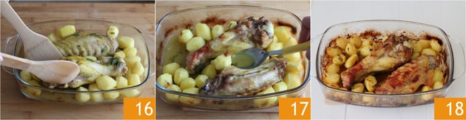 Nach 30 Minuten aus dem Ofen nehmen, die Alufolie entfernen und die Truthahnteile wenden. Den Garprozess im Ofen fortsetzen, ohne Alufolie für 50-60 Minuten. Die Zutaten häufig wenden, um sie gut anbräunen zu lassen, und mit dem Bratensaft begießen 17. In den letzten 10 Minuten einige Butterflöckchen auf das Fleisch geben, um eine knusprige Kruste zu erzeugen. Der gebackene Truthahn ist bereit zum Servieren 18.