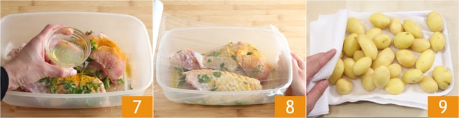 und den Zitronensaft 7. Alles mit den Händen vermischen, um das Fleisch mit den Aromen zu bedecken. Mit Frischhaltefolie abdecken 8 und 1 Stunde marinieren lassen. In der Zwischenzeit die jungen Kartoffeln waschen und schälen 9 und halbieren oder, wenn gewünscht, ganz lassen.