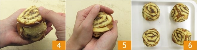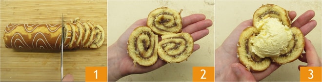 Um das gebratene Eis zuzubereiten, schneiden Sie zuerst die Rolle in Scheiben von etwa einem halben cm Dicke 1; Sie benötigen insgesamt 16 davon. Legen Sie 3 Scheiben in die Handfläche 2 und platzieren Sie in der Mitte eine Kugel Eis, wobei Sie einen Eisportionierer zur Hilfe nehmen 3.