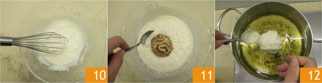 Vermischen Sie alles mit einem Schneebesen, um eine gleichmäßige, cremige und klumpenfreie Masse zu erhalten 10. Nach der Kühlzeit gießen Sie das Pflanzenöl zum Frittieren in einen Topf und erhitzen Sie es auf 170°-180°. Tauchen Sie eine Kugel nacheinander in den Teig, drehen Sie sie mit einem Löffel, um sie vollständig zu überziehen 11, dann tauchen Sie sie in das heiße Öl 12.