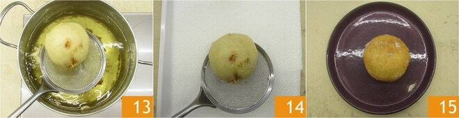 Frittieren Sie die Kugel 2-3 Minuten lang, bis sie goldbraun ist, dann nehmen Sie sie heraus 13 und legen Sie sie auf saugfähiges Papier 14. Setzen Sie diesen Vorgang mit allen anderen Stücken fort und servieren Sie Ihr gebratenes Eis sofort 15!