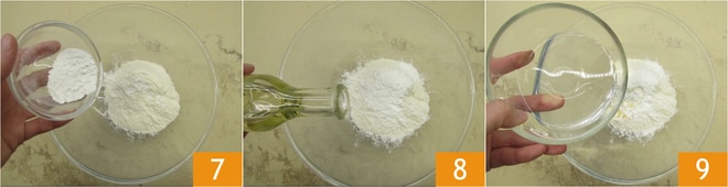In der Zwischenzeit bereiten Sie den Teig vor: Sieben Sie das Mehl in eine Schüssel, fügen Sie dann das Backpulver 7, das Pflanzenöl 8 und das kalte Wasser 9 hinzu.