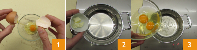 Um Spiegeleier zuzubereiten, beginnen Sie damit, ein paar Eier bei Zimmertemperatur in eine Schüssel zu schlagen 1. Schmelzen Sie die Butter in einem Stahltopf 2 und geben Sie dann die Eier vorsichtig hinzu 3.
