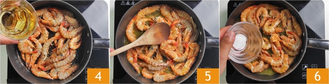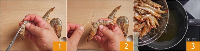 Um die gebratenen Garnelen zuzubereiten, entfernen Sie zuerst den Darm der Krustentiere, indem Sie den Panzer am Rücken aufschneiden 1 und ihn vorsichtig mit einem Zahnstocher herausziehen 2. Es ist nicht notwendig, den Panzer, den Kopf und die Beine zu entfernen. Erhitzen Sie das Öl in einer Pfanne und braten Sie die Garnelen 2-3 Minuten lang an 3.