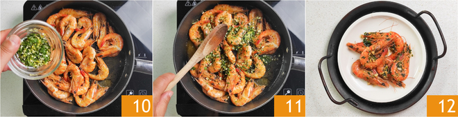 Fügen Sie die Gremolata zu den Garnelen hinzu 10 und braten Sie sie noch ein paar Minuten, um sie mit der Soße zu vermengen 11. Schalten Sie die Hitze ab und servieren Sie sofort Ihre gebratenen Garnelen 12!