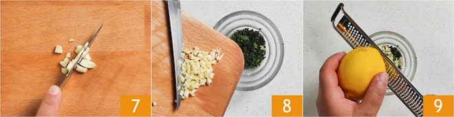 In der Zwischenzeit die Gremolata vorbereiten: Den Knoblauch fein hacken 7, dann mit der gehackten Petersilie 8 und der abgeriebenen Zitronenschale 9 vermengen. Gut mischen.