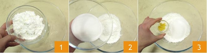 Um die gebratene Milch zuzubereiten, geben Sie in eine große Schüssel die Stärke 1, den Zucker 2 und die abgeriebene Zitronenschale 3.