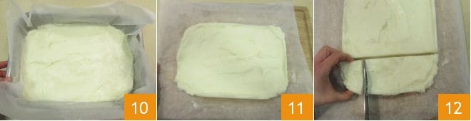 Glätten Sie sie gut 10 und lassen Sie sie im Kühlschrank über Nacht erkalten (es ist keine Frischhaltefolie nötig, da es keine Rolle spielt, ob sich eine Haut bildet, da die Creme für dieses Rezept gut gekühlt und fest sein muss). Sobald die Creme kalt ist 11, schneiden Sie sie in unregelmäßige Würfel von etwa 4 cm 12. Mit diesen Mengen und dieser Form erhalten Sie etwa 18 Stück.