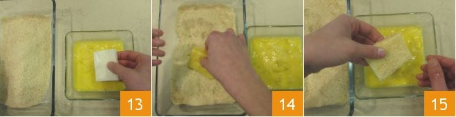 Wenden Sie jedes Stückchen Creme zuerst in verquirlten Eiern 13, dann in Semmelbröseln 14 und dann nochmals in Eiern 15 und Semmelbröseln, für eine doppelte Panierung.