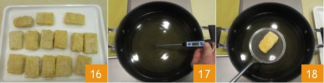 Während Sie die Häppchen panieren, legen Sie sie auf ein Tablett 16. Erhitzen Sie das Öl im Topf und wenn es 170°C erreicht hat 17, tauchen Sie die Häppchen ein 18. Frittieren Sie nur wenige auf einmal, um die Temperatur des Öls nicht zu senken. Es genügt etwa eine Minute.