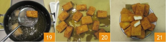 Wenn die Häppchen goldbraun sind, heben Sie sie heraus 19 und lassen Sie sie auf einem mit Küchenpapier ausgelegten Tablett abtropfen 20. Servieren Sie Ihre gebratene Milch sofort heiß 21.