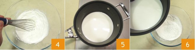 Vermischen Sie diese trockenen Zutaten 4 und stellen Sie sie beiseite. Erhitzen Sie in einem kleinen Topf die Milch 5 und sobald sie den Siedepunkt erreicht hat, gießen Sie sie nach und nach unter Rühren in die Schüssel mit den trockenen Zutaten 6, um Klumpenbildung zu vermeiden.