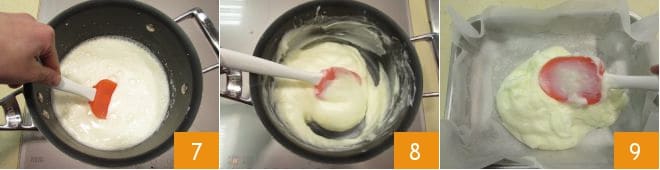 Geben Sie alles zurück in den Topf, stellen Sie es bei schwacher Hitze auf den Herd und rühren Sie ständig mit einer Marisa oder einem Holzlöffel 7. Wenn Sie bemerken, dass die Creme klumpig wird und gleichzeitig eindickt 8, schalten Sie die Hitze aus und rühren Sie kräftig. Sie werden sehen, dass die Creme glatt wird, wenn sie von der Wärmequelle entfernt ist. Es ist wichtig, diesen Vorgang mit einem Holzlöffel oder einer Marisa zu machen und nicht mit dem Schneebesen, da der Schneebesen die Creme zerreißen könnte, wodurch sie während der Abkühlzeit wässrig und nicht perfekt eingedickt wird. Sobald die Creme fertig ist, gießen Sie sie schnell in eine rechteckige Form von etwa 26x19 cm, die mit Backpapier ausgelegt ist 9.