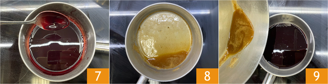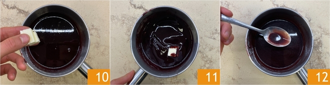 Sie sollten eine sirupartige Konsistenz erhalten 7. Wenn auch die Hühnerbrühe zu einem konzentrierten Flüssigkeit reduziert ist 8, fügen Sie sie dem Granatapfelsirup hinzu, während beide noch heiß sind 9.