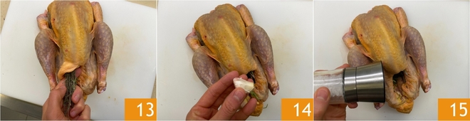 Entfernen Sie die verbleibenden Federn mit einem Brenner, dann füllen Sie die Höhle des Perlhuhns mit den aromatischen Kräutern 13, der Knoblauchzehe 14 und dem Salz 15.