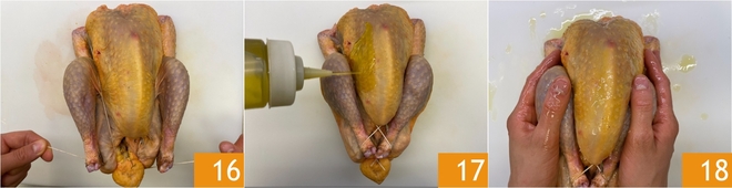 Binden Sie das Perlhuhn mit Küchengarn, um die Schenkel und Flügel zu fixieren 16. Würzen Sie das Äußere mit Öl 17 und Salz und massieren Sie es gut in das Fleisch ein, um es gut zu würzen 18.