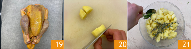 Legen Sie das Perlhuhn in eine mit Backpapier ausgelegte Auflaufform und backen Sie es im statischen Ofen bei 200° für 20 Minuten 19. In der Zwischenzeit schälen Sie die Kartoffeln und schneiden Sie sie in 1,5 cm große Würfel 20. Würzen Sie die Kartoffeln mit Öl, Salz, Thymian und Rosmarin und mischen Sie alles gut 21.