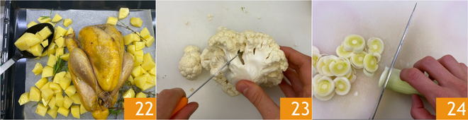 Nach 20 Minuten Backzeit nehmen Sie die Auflaufform mit dem Perlhuhn heraus und verteilen Sie die Kartoffeln rundherum 22, dann backen Sie erneut und fahren Sie mit dem Backen für weitere 10 Minuten fort. In der Zwischenzeit teilen Sie den Blumenkohl in Röschen 23 und schneiden Sie den Lauch in etwa einen halben Zentimeter dicke Scheiben 24.