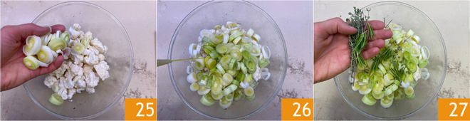 Fügen Sie den Blumenkohl dem Lauch in einer Schüssel hinzu 25 und würzen Sie mit Öl 26, Salz, Thymian und Rosmarin 27.