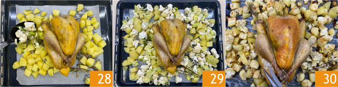 Nach weiteren 10 Minuten Backzeit nehmen Sie die Auflaufform mit dem Perlhuhn heraus und fügen Sie auch die Blumenkohl-Lauch-Mischung hinzu 28. Fahren Sie mit dem Backen für weitere 30 Minuten oder bis das Perlhuhn gar ist fort; Sie können das Fleisch mit einem Zahnstocher durchstechen und prüfen, ob eine klare Flüssigkeit austritt 29. Sobald es fertig ist, entfernen Sie das Küchengarn 30.