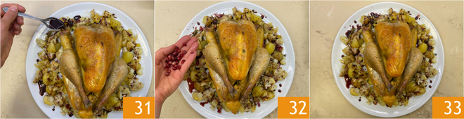 Richten Sie das Perlhuhn an und übergießen Sie es mit der Granatapfelsauce 31, dann garnieren Sie es mit den beiseite gelegten Kernen 32. Ihr Perlhuhn im Ofen mit Kartoffeln, Blumenkohl und Granatapfel ist bereit zum Servieren 33!