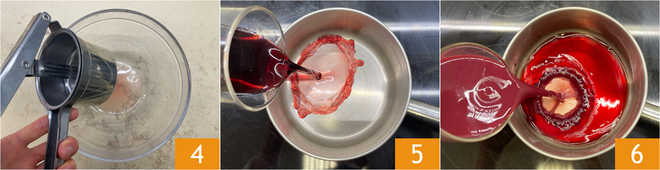 Pressen Sie die Granatapfelkerne mit einer Kartoffelpresse aus, um den Saft zu gewinnen, und bewahren Sie einige für das Anrichten auf 4. Geben Sie den Rotwein 5 und 250 g Granatapfelsaft 6 in einen kleinen Topf, erhitzen Sie ihn bei mittlerer Hitze und lassen Sie ihn etwa 20-30 Minuten reduzieren.