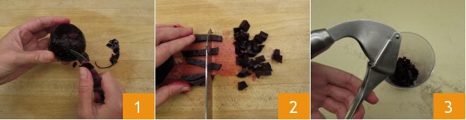 Um die frittierten Pilze mit Rote-Bete-Mayonnaise zuzubereiten, beginnen Sie genau mit letzterer. Wenn Sie Ihre Hände nicht färben möchten, verwenden Sie Handschuhe, schälen Sie dann die Rote Bete 1 und schneiden Sie sie zuerst in Scheiben, dann in Streifen und schließlich in Würfel 2. Geben Sie sie in den Mixerbecher zusammen mit dem geschälten Ingwer 3,