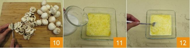 Schneiden Sie sie schließlich in 3-4 mm dicke Scheiben 10. Brechen Sie die Eier in eine Schüssel, fügen Sie die Milch und eine Prise Salz hinzu 11 und schlagen Sie leicht 12.