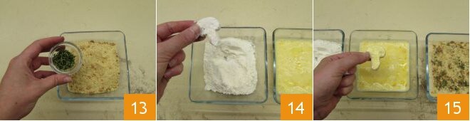 Geben Sie dann den abgezupften Thymian in die grob gemahlenen Semmelbrösel 13, mischen Sie auch dies und beginnen Sie mit dem Panieren. Bestäuben Sie die Pilze zuerst mit Mehl 14, tauchen Sie sie dann in die Eier 15