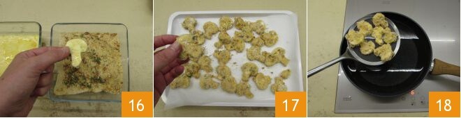 und schließlich in die Semmelbrösel 16. Wiederholen Sie dies für alle und legen Sie die panierten Pilze nach und nach auf ein mit Backpapier ausgelegtes Tablett 17. Wenn alle fertig sind, kochen Sie eine Handvoll Pilze in einem Topf mit heißem Öl bei 170° (mit einem Küchenthermometer messen) 18.