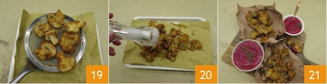 Nach etwa zwei Minuten oder wenn sie gut goldbraun sind, lassen Sie sie auf saugfähigem Papier abtropfen 19. Fügen Sie noch eine Prise Salz hinzu 20 und richten Sie schließlich Ihre frittierten Pilze mit Rote-Bete-Mayonnaise an und guten Appetit 21