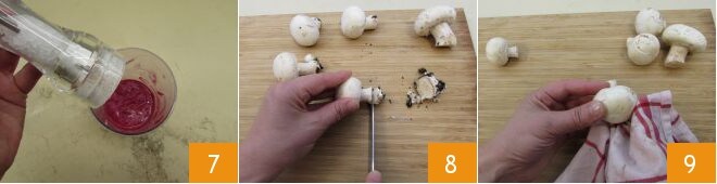 Wenn Sie eine flüssige und glatte Sauce erhalten haben, würzen Sie sie mit Salz und stellen Sie sie beiseite 7. Wenden Sie sich den Pilzen zu. Schneiden Sie den erdigen Teil des Stängels ab 8 und reinigen Sie sie mit einem feuchten Tuch, um die Erde abzuwischen. Es ist besser, die Pilze nicht zu waschen, da sie Wasser aufnehmen 9.