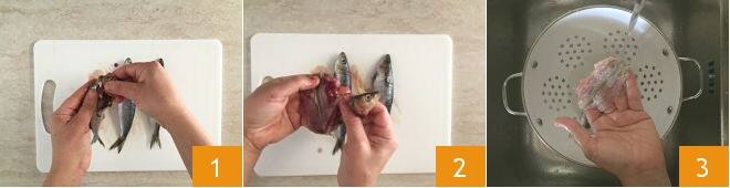 Um die frittierten Sardinen zuzubereiten, müssen Sie als erstes mit der Reinigung der Sardinen beginnen. Mit leichtem Druck der Finger können Sie den Kopf mühelos abtrennen 1, und zusammen mit dem Kopf können Sie auch die Innereien leicht herausziehen. Sobald der Kopf und die Innereien abgetrennt sind, müssen Sie die Fische nur noch vorsichtig mit den Fingern öffnen, indem Sie sie aufklappen, so dass Sie auch die Gräten leicht herausziehen können 2. Spülen Sie die gereinigten Sardinen unter fließendem Wasser ab 3,