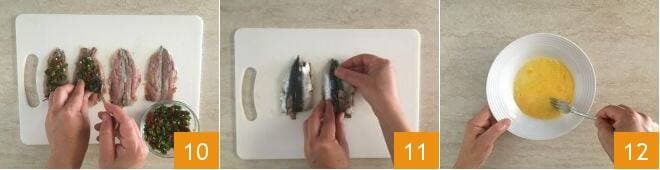 Füllen Sie die Hälfte der Sardinen mit der zubereiteten Mischung 10, schließen Sie sie dann mit den restlichen, um Paare von zwei zu bilden 11. Die Anzahl der erhaltenen Sardinen kann je nach Größe variieren. Schlagen Sie die Eier in einem tiefen Teller auf, salzen Sie sie leicht und verrühren Sie sie mit einer Gabel 12, geben Sie das Paniermehl in einen anderen Teller.