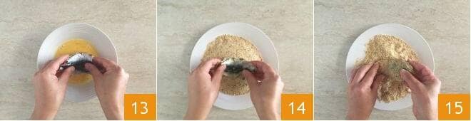 Wenden Sie die Sardinen erst im Ei 13, dann im Paniermehl 14. Wenn Sie sie durch das Paniermehl ziehen, drücken Sie leicht, damit es gut haftet 15.