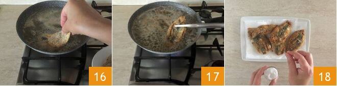 Geben Sie das Öl in eine große Pfanne, erhitzen Sie es, und frittieren Sie die Sardinen 16, indem Sie sie etwa 2 Minuten pro Seite braten, oder bis sie goldbraun sind. Lassen Sie die Sardinen abtropfen 17 und legen Sie sie auf saugfähiges Papier, dann salzen Sie sie 18.