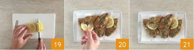 Schneiden Sie die Zitrone in Scheiben 19 und legen Sie sie neben die frittierten Sardinen 20. Garnieren Sie mit gehackter Petersilie und servieren Sie 21.