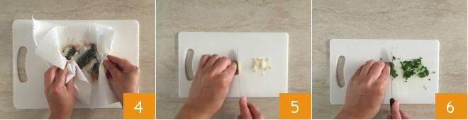 trocknen Sie sie ab, legen Sie sie auf saugfähiges Papier und tupfen Sie sie vorsichtig ab, um sie gut zu trocknen 4. Hacken Sie nun den Knoblauch 5, die Petersilie 6,